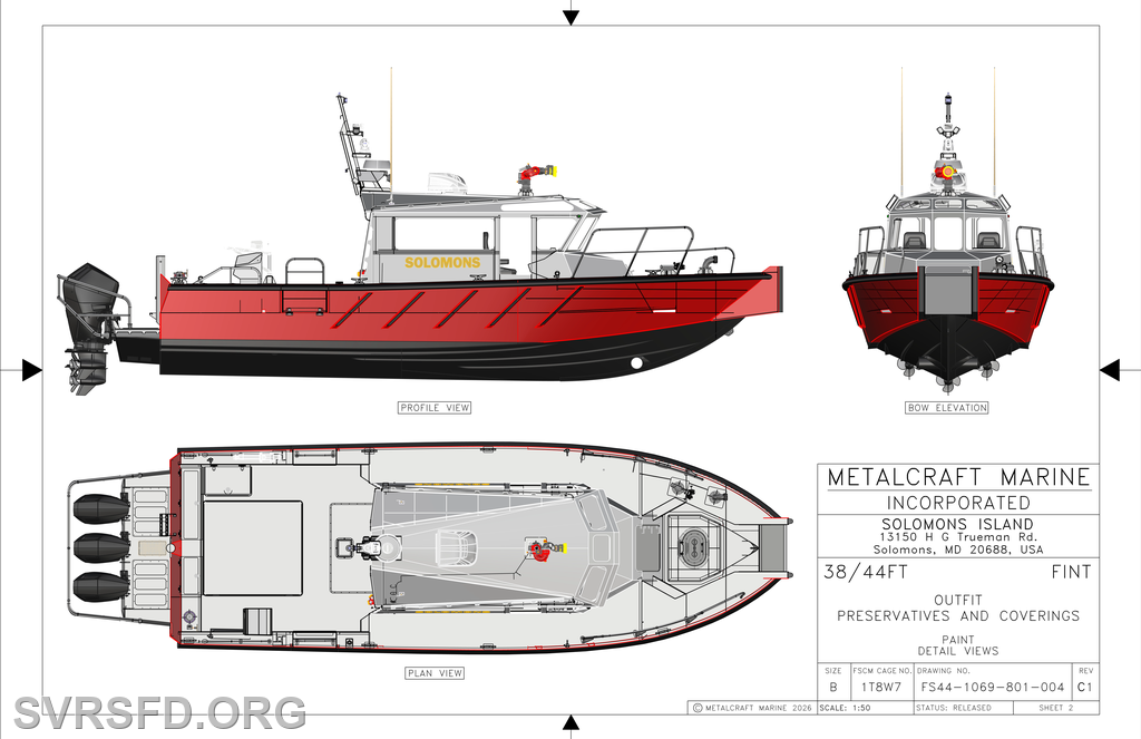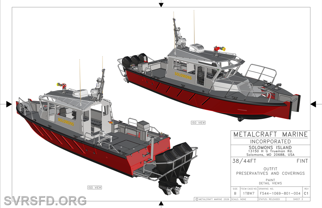 Fire Boat 3 will be housed in Solomons with the continued support from the Pilots Association of Maryland. The funding was made in conjunction with Solomons VRSFD, community donations, Calvert County government and the awarding of a FEMA Port Security Grant Program. Construction started in early March 2026 and is expected to take delivery within 12 months. This process has been in development for nearly 5 years to provide the community and local waterways with a vessel capable of handling the call volume while ensuring crew safety during unpredictable weather conditions. Fire Boat 3 is intended to have a 30-year service life through proper care and maintenance.